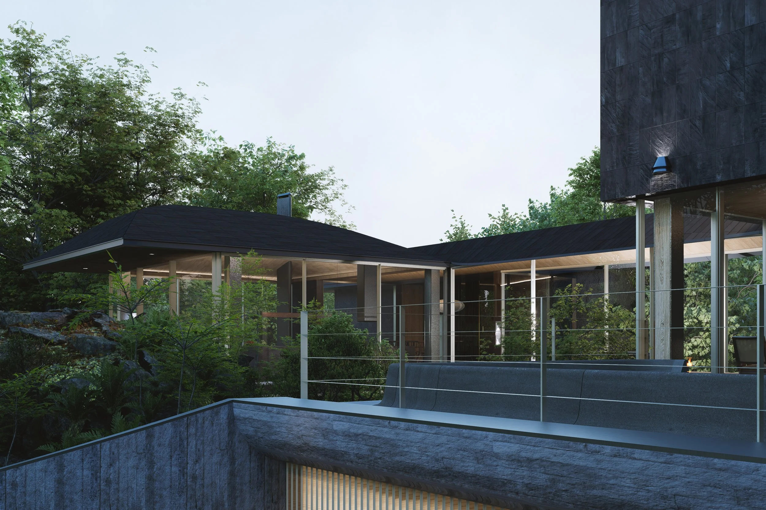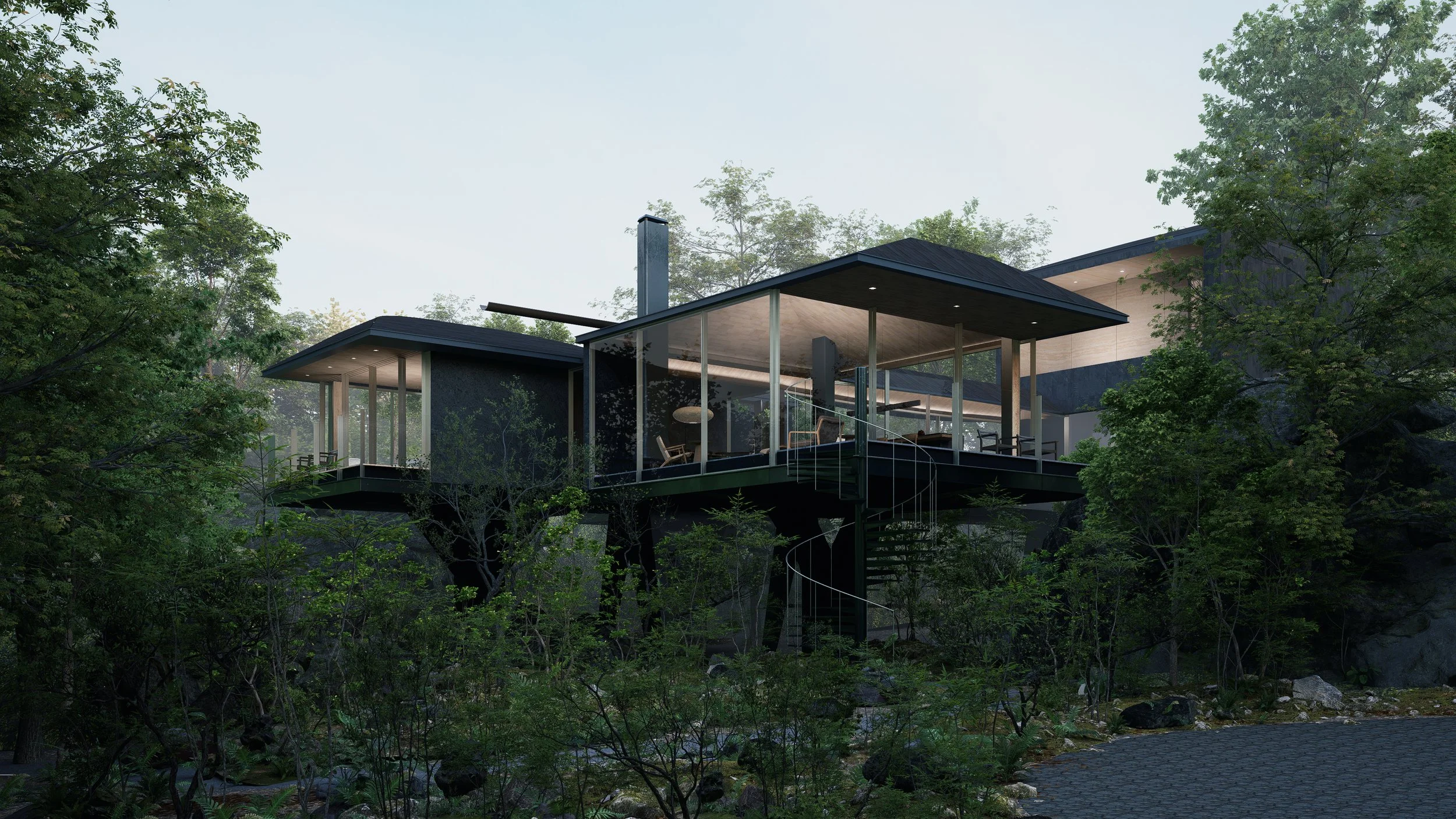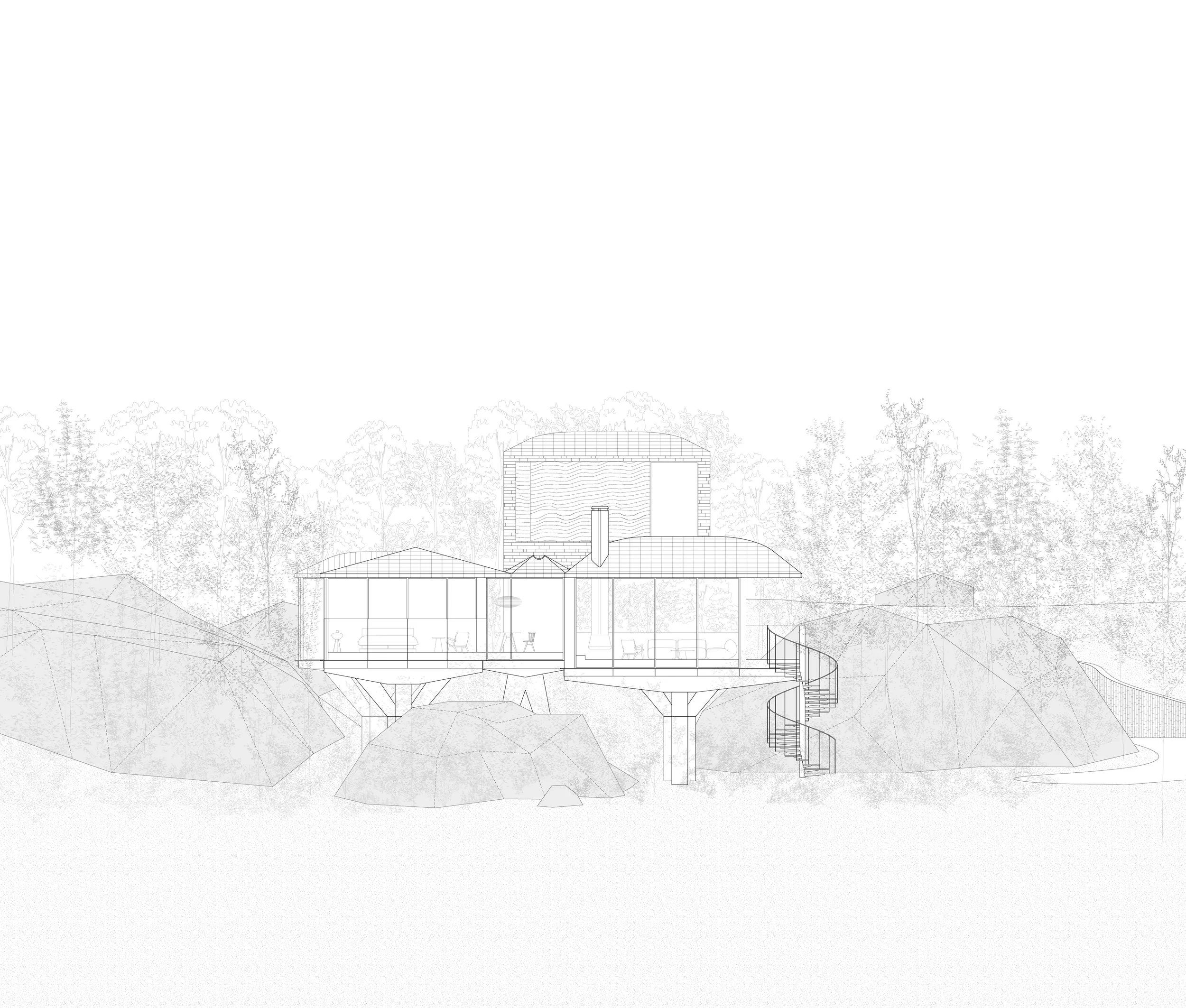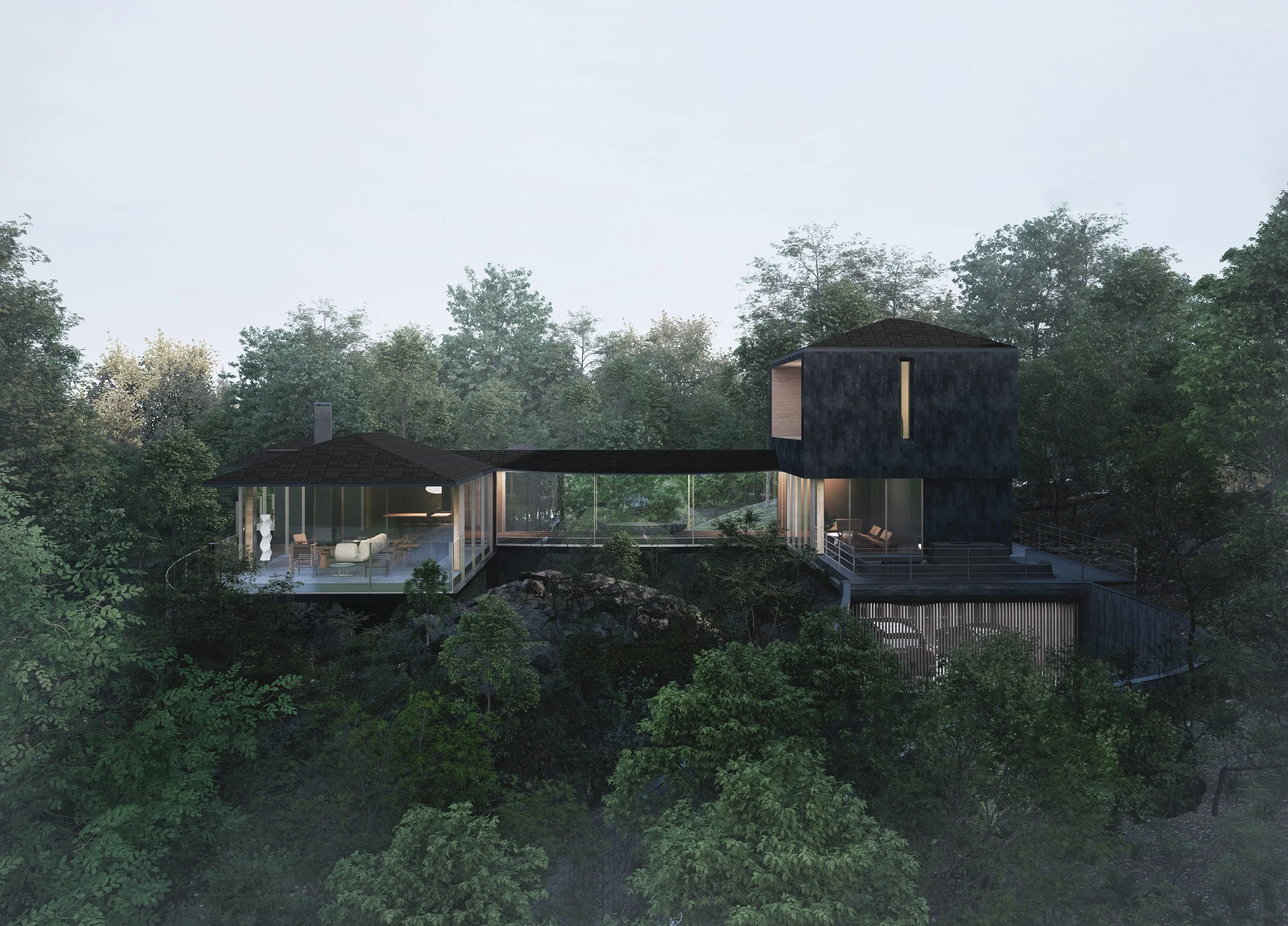Nestled between rocks and a dense forest, House with a Bridge is designed to evoke the sensation of wandering through the woods. The project tries to minimize its architectural intervention to respect untouched nature of existing rocks and trees. A grounded south wing, which features solid stone walls and carefully framed views that anchor the space in its natural setting. In contrast, the elevated north wing allows ferns and ground cover to flourish beneath, boasting expansive glass walls that reveal panoramic views of the forest. The bridge connecting the two wings enhances this immersive experience, merging the natural surroundings with the architectural form. This integration fosters a seamless connection between the built environment and its setting, creating a living experience that is both harmonious and inviting, and thus blurs boundaries between architecture and nature.