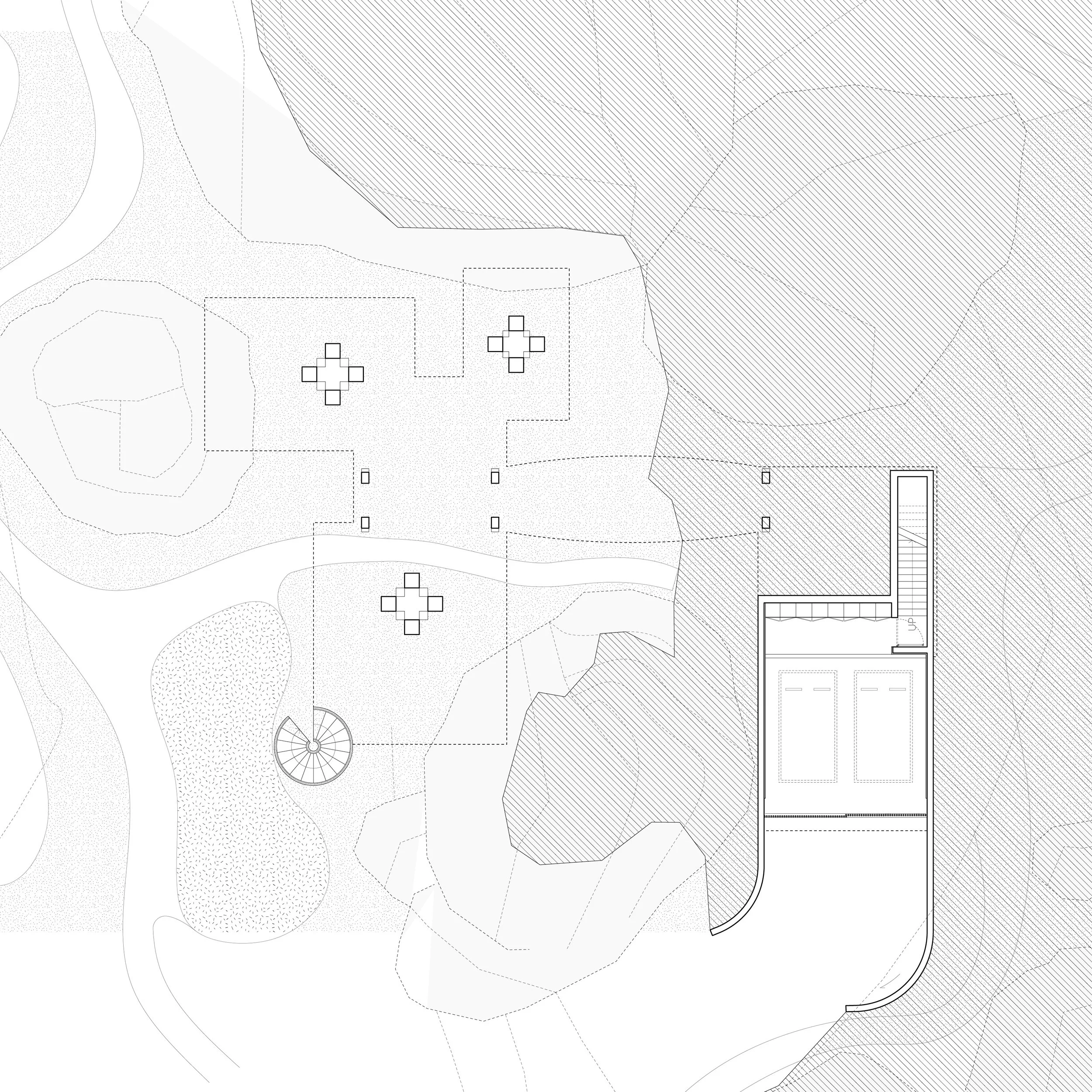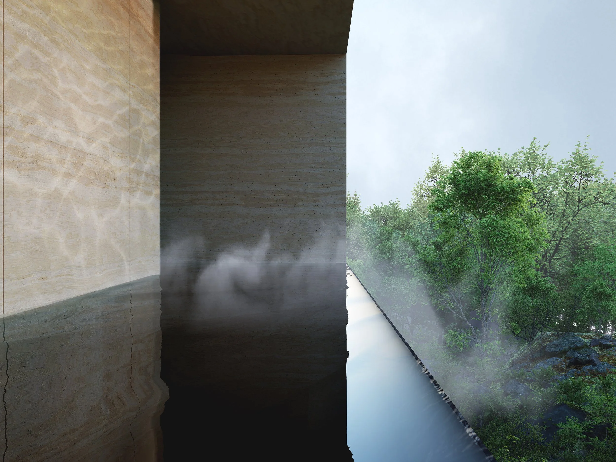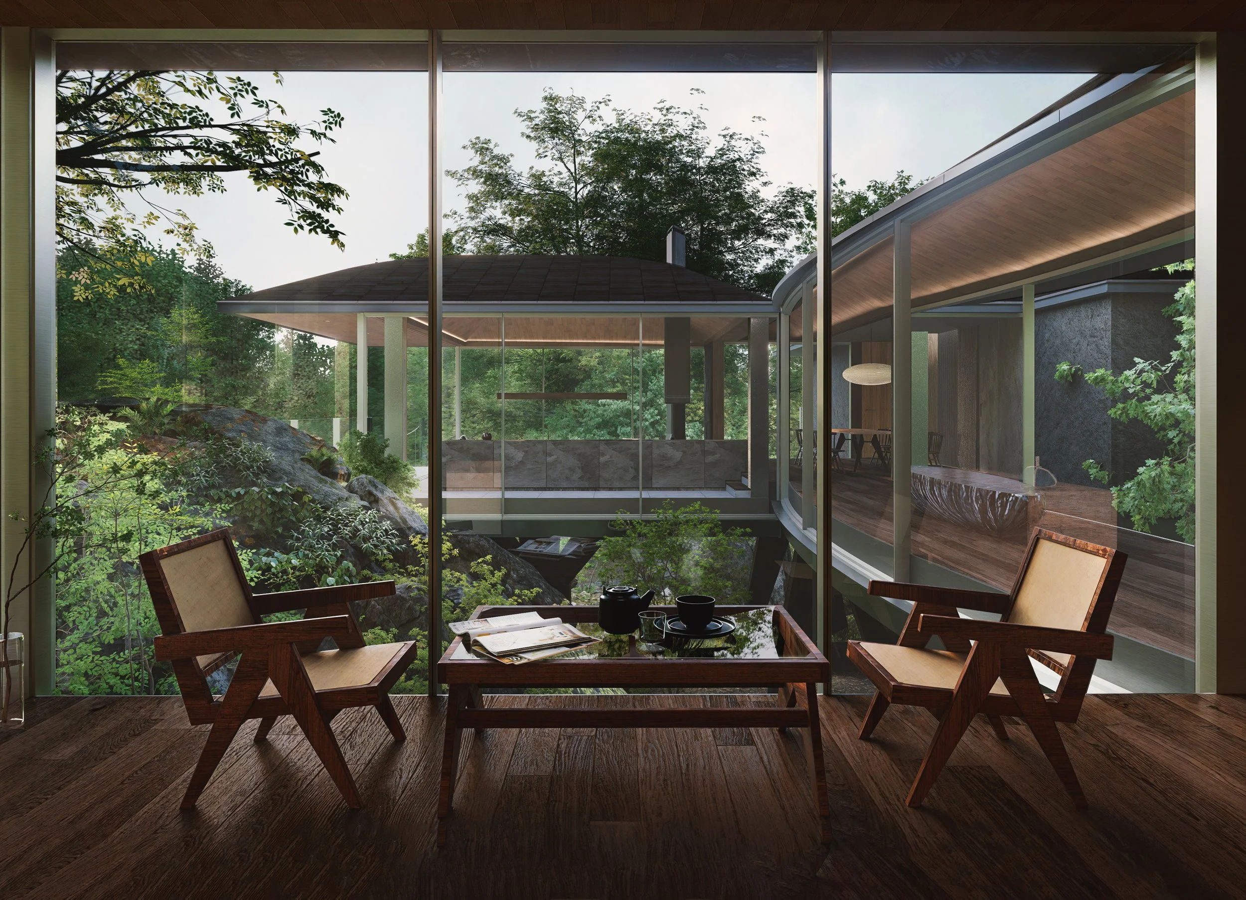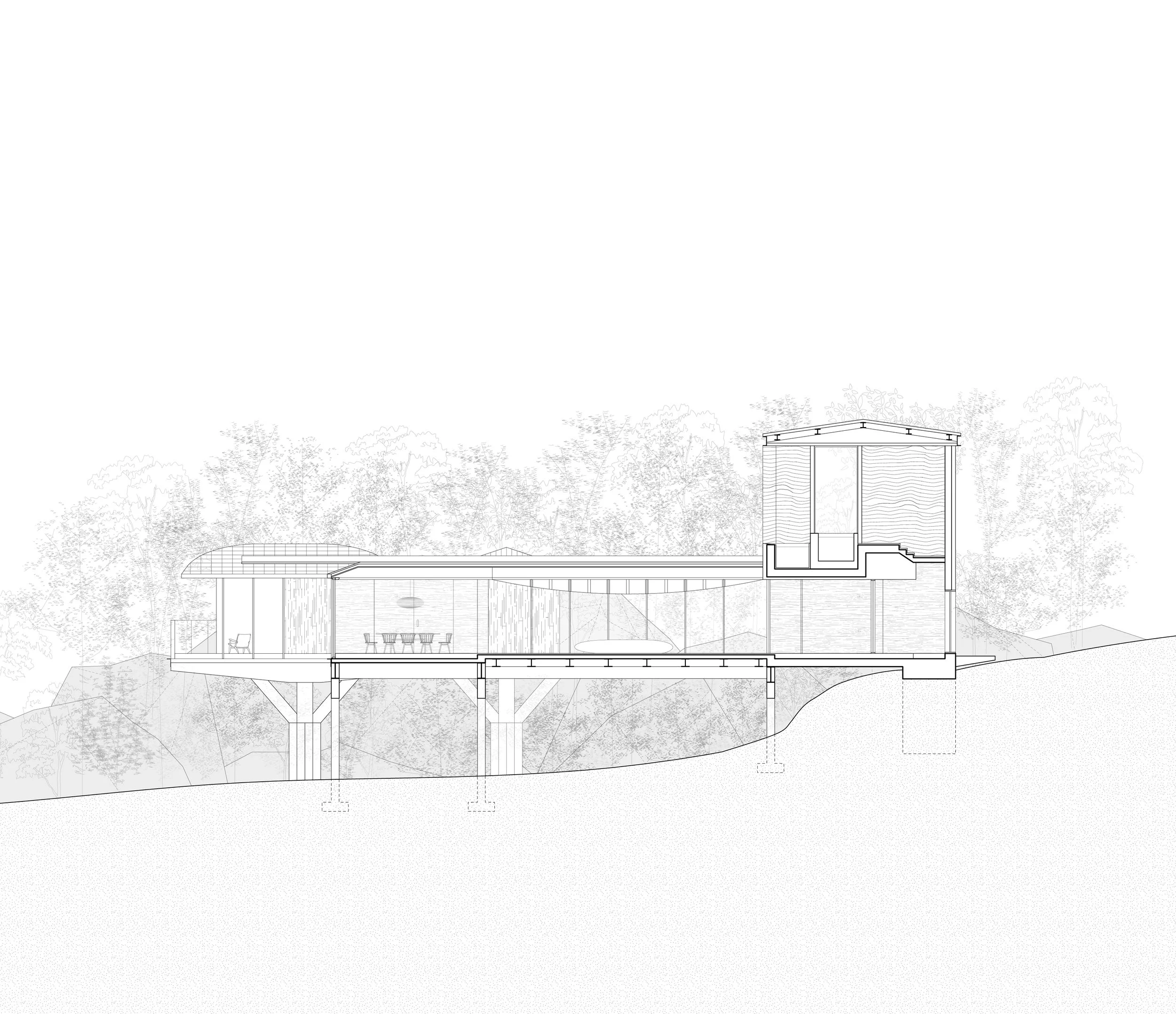 Nestled between rocks and a dense forest, House with a Bridge is designed to evoke the sensation of wandering through the woods. The project tries to minimize its architectural intervention to respect untouched nature of existing rocks and trees. A grounded south wing, which features solid stone walls and carefully framed views that anchor the space in its natural setting. In contrast, the elevated north wing allows ferns and ground cover to flourish beneath, boasting expansive glass walls that reveal panoramic views of the forest. The bridge connecting the two wings enhances this immersive experience, merging the natural surroundings with the architectural form. This integration fosters a seamless connection between the built environment and its setting, creating a living experience that is both harmonious and inviting, and thus blurs boundaries between architecture and nature.