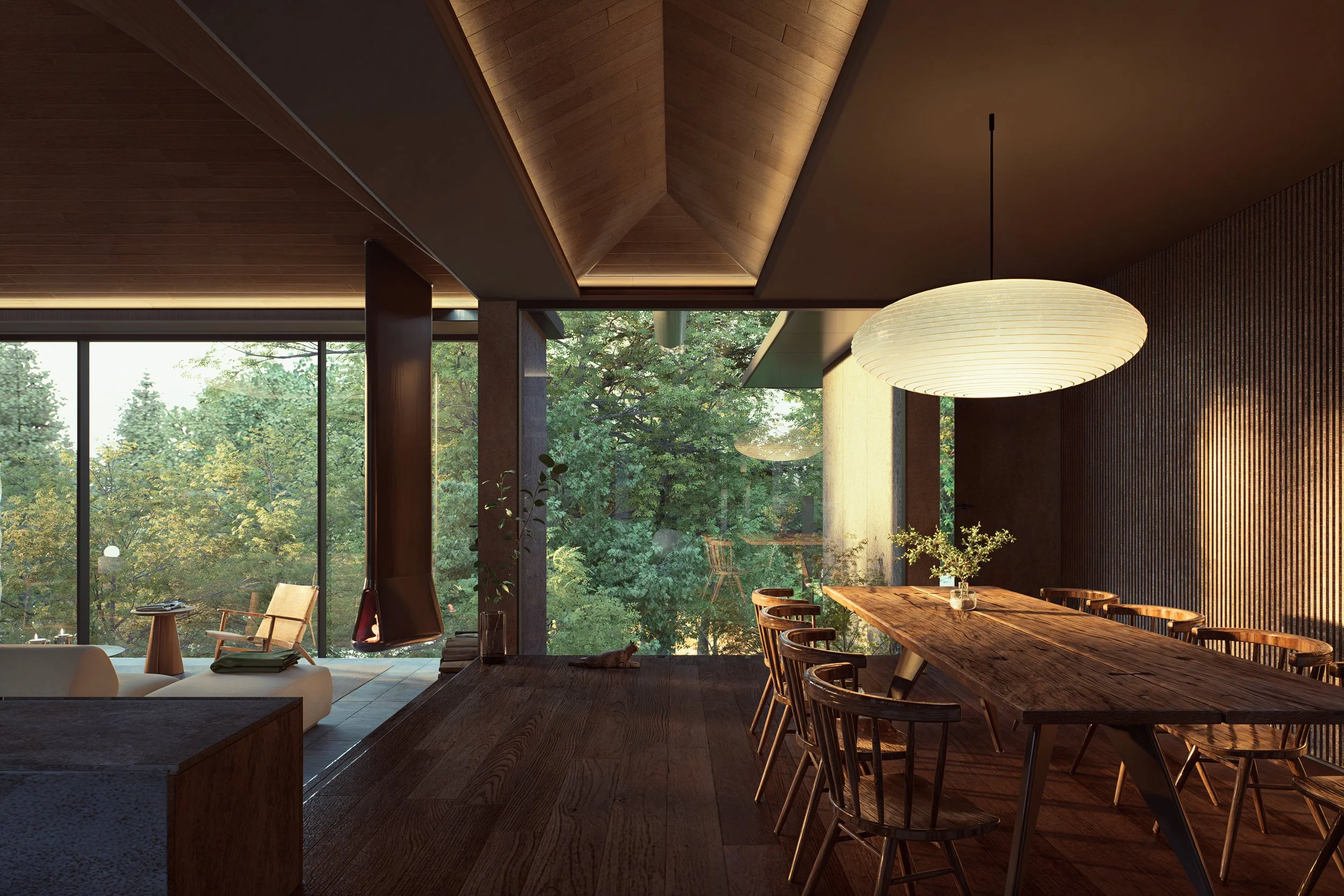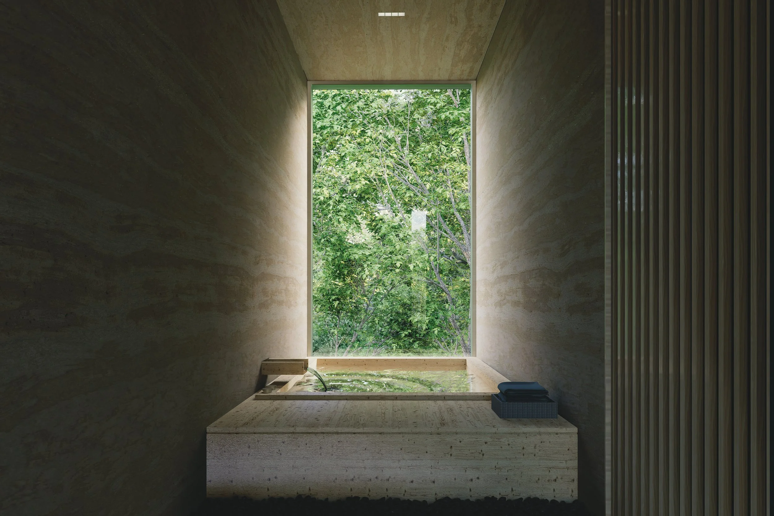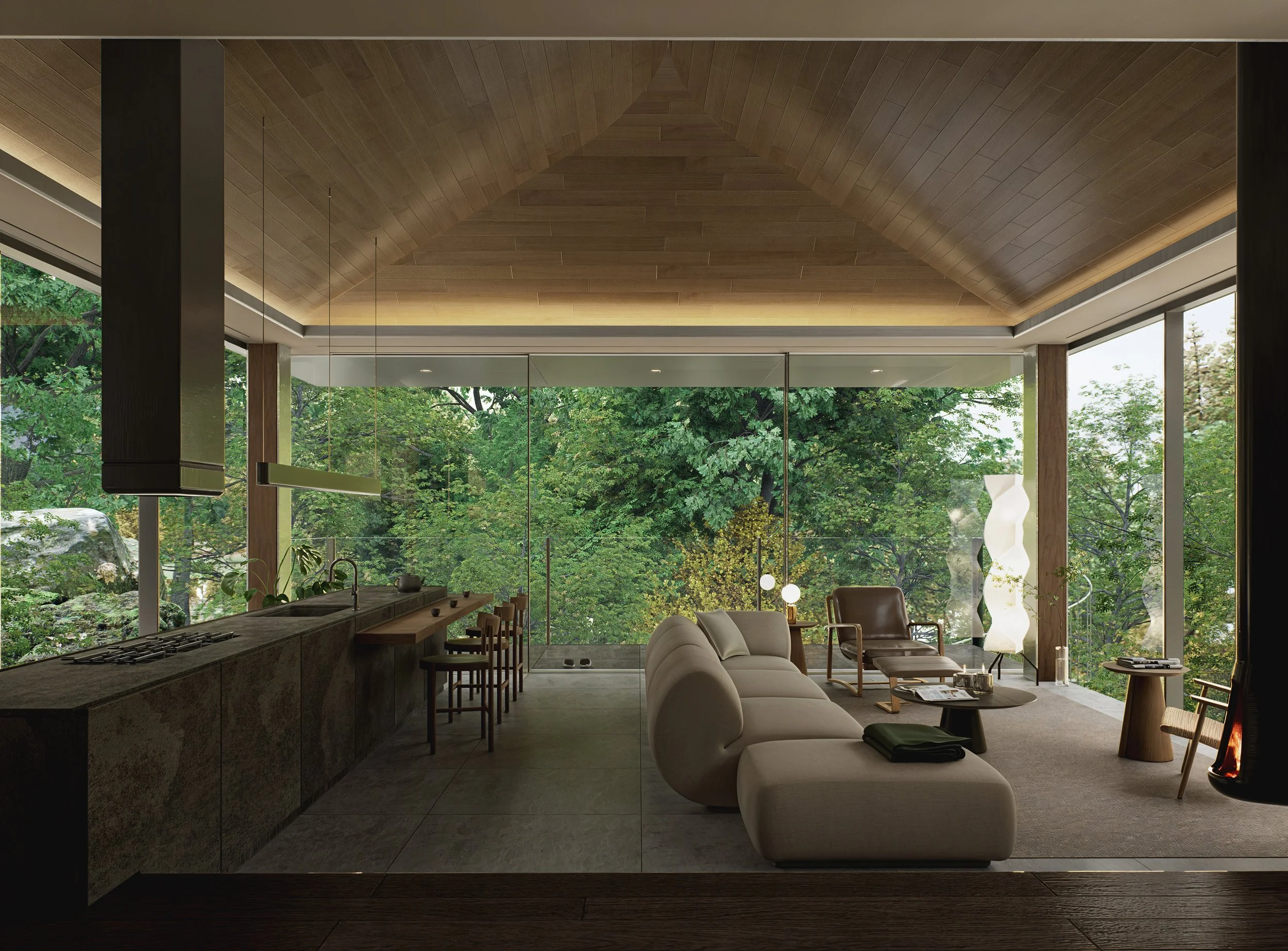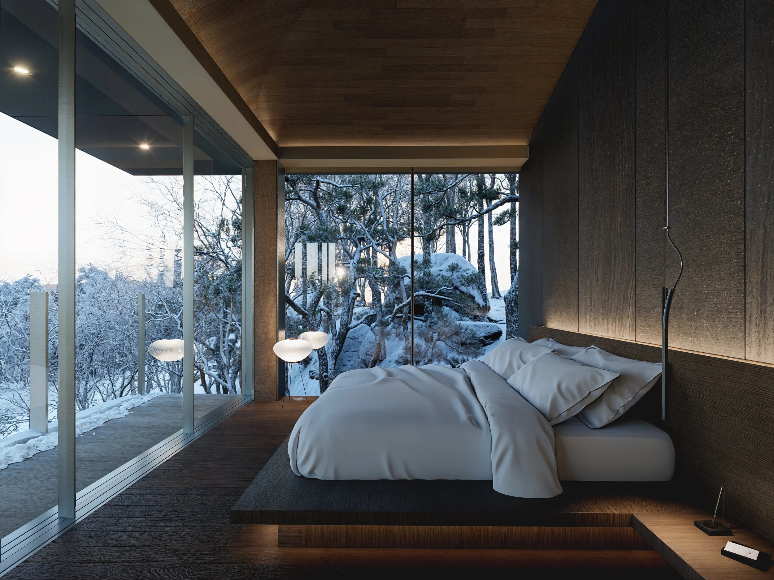 Nestled between rocks and a dense forest, House with a Bridge is designed to evoke the sensation of wandering through the woods. The project tries to minimize its architectural intervention to respect untouched nature of existing rocks and trees. A grounded south wing, which features solid stone walls and carefully framed views that anchor the space in its natural setting. In contrast, the elevated north wing allows ferns and ground cover to flourish beneath, boasting expansive glass walls that reveal panoramic views of the forest. The bridge connecting the two wings enhances this immersive experience, merging the natural surroundings with the architectural form. This integration fosters a seamless connection between the built environment and its setting, creating a living experience that is both harmonious and inviting, and thus blurs boundaries between architecture and nature.